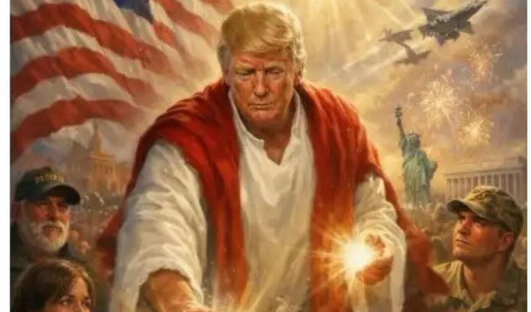 Ο Ντόναλντ Τραμπ δημοσίευσε στο Truth Social μια ψηφιακά επεξεργασμένη εικόνα, η οποία φαίνεται να έχει παραχθεί με εργαλεία τεχνητής νοημοσύνης. Σε αυτήν παρουσιάζεται με τελετουργική ενδυμασία σε λευκές και κόκκινες αποχρώσεις, να ακουμπά το χέρι του σε έναν καταβεβλημένο ασθενή πάνω σε νοσοκομειακό κρεβάτι. Τη σκηνή πλαισιώνουν άτομα με στάση προσμονής ή προσευχής, ενώ στο βάθος εμφανίζονται έντονα πατριωτικά σύμβολα των ΗΠΑ, όπως η σημαία, το Άγαλμα της Ελευθερίας, πολεμικά αεροσκάφη και αετοί.